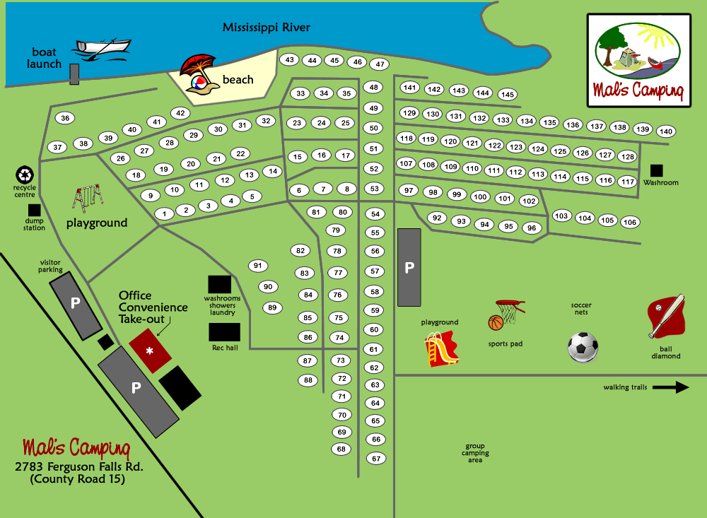 We have 140 serviced and 10 tent sites. We are able to accomodate larger units requiring pull through sites. We offer 15 and 30 amp hook ups and provide a mobile pump out service on Tuesdays. All sites are large, grassy and well treed with picnic tables and firepits at each site. |
